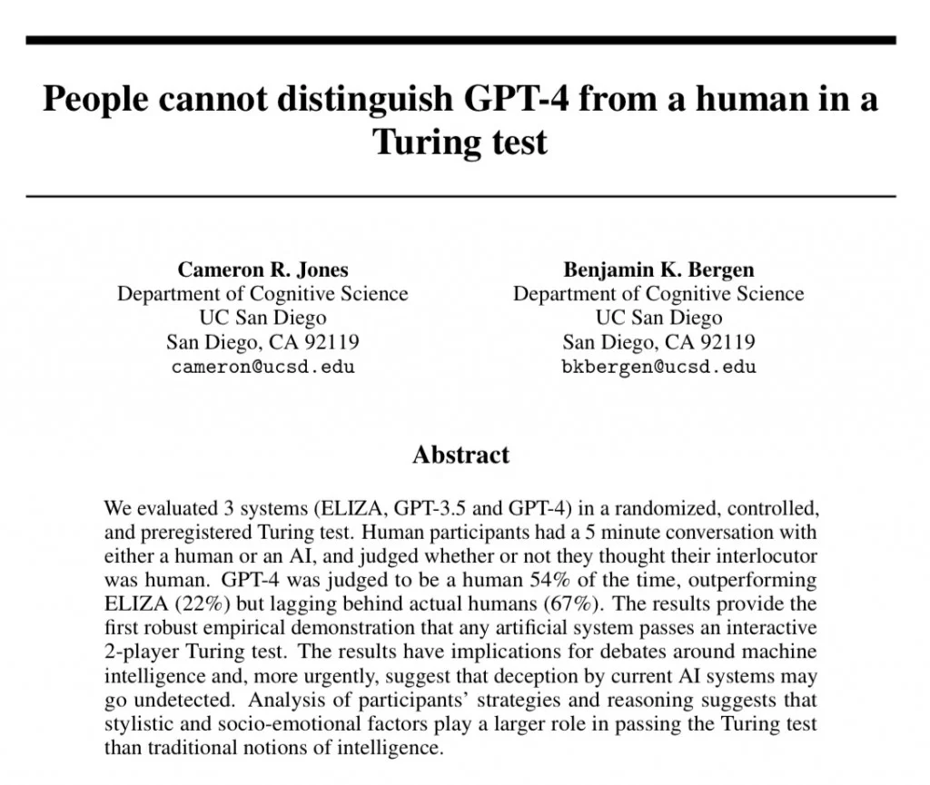 I ricercatori dell’Università della California, a San Diego, hanno pubblicato un articolo scientifico in cui affermano che gli esseri umani non sono in grado di distinguere il GPT-4 dagli esseri umani nel test di Turing.