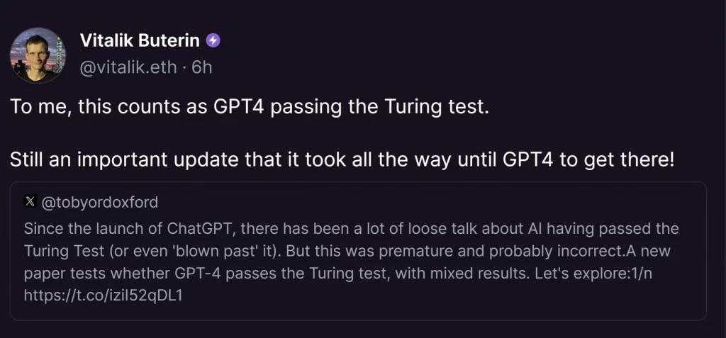 Ha notato che la capacità di distinguere una persona da un bot è ora paragonabile al lancio di una moneta. Buterin ha sottolineato l’importanza di questo risultato, sottolineando che il superamento della fase del test di Turing è un traguardo importante che conferma la serietà dei risultati ottenuti nel campo dell’intelligenza artificiale.