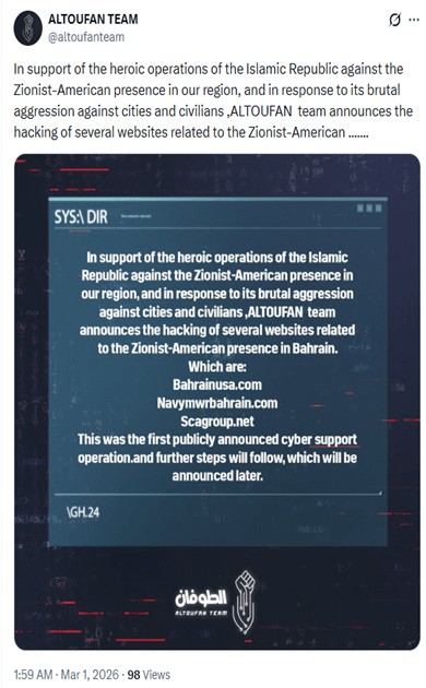 I gruppi sostenuti da Teheran hanno già collaborato in passato con gli operatori di ransomware. Nell’estate del 2025, durante il conflitto, sono emerse offerte di generose ricompense per le infezioni di organizzazioni americane e israeliane. Lo scorso fine settimana, Cotton Sandstorm ha attivato il suo alias online, Altoufan Team, e ha annunciato nuovi obiettivi in Bahrein.