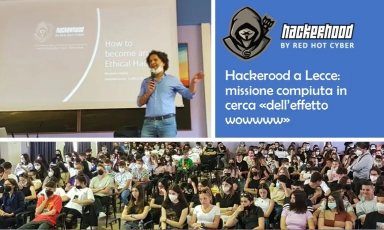 Ricordiamo sempre che RHC e la community di HackerHood rimane a disposizione delle scuole medie e delle scuole superiori per poter replicare l’esperienza fatta a Lecce e cercare di invogliare e indirizzare i ragazzi verso l’ethical hacking, per cercare di stimolarli verso l’esplorazione, lo studio empirico, il superamento degli ostacoli e l’innovazione.