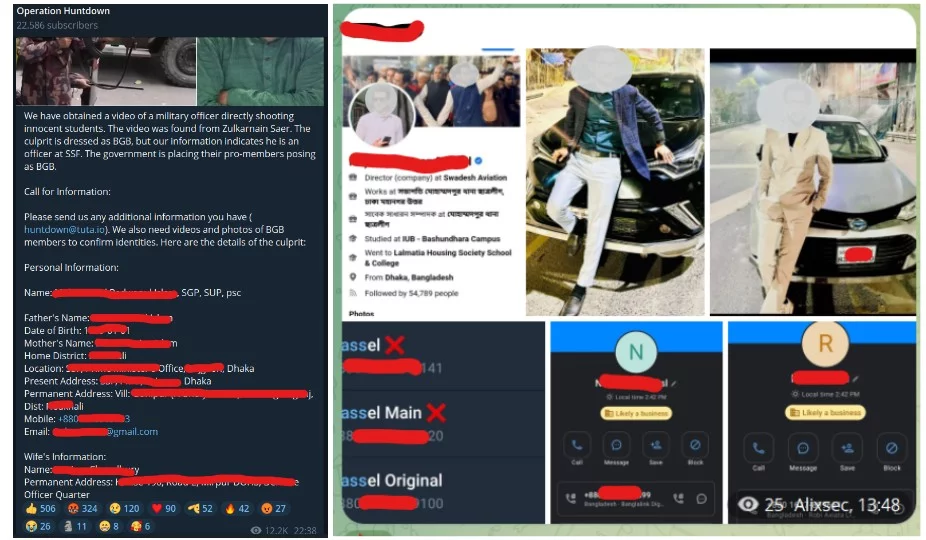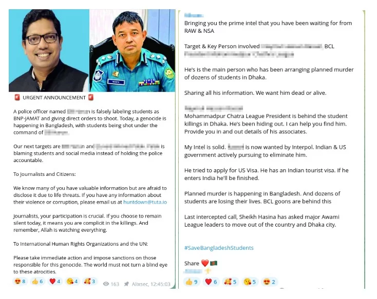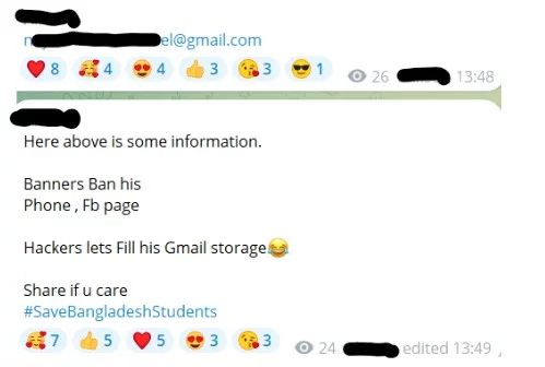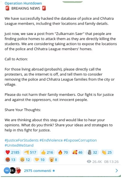 Sui principali canali Telegram, l’attività di hacktivismo a favore degli studenti del Bangladesh sta proseguendo con la ricerca delle persone chiave responsabili dell’oppressione e delle escalation contro le proteste.