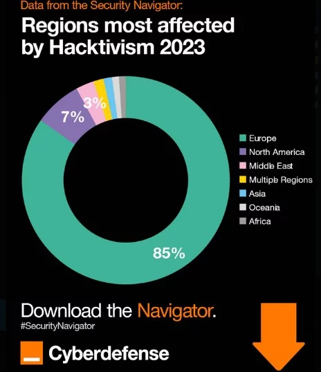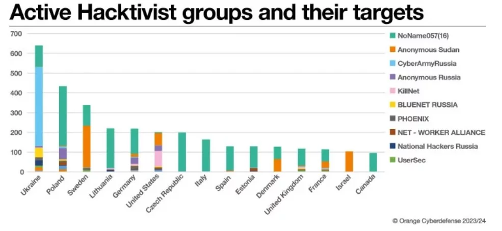 Infatti come si può notare dal report di Orange Cyberdefense, nel periodo 2023/2024 noi europei rappresentiamo la regione più colpita dagli Hacktivisti con l’Ucraina come principale target di queste attività: