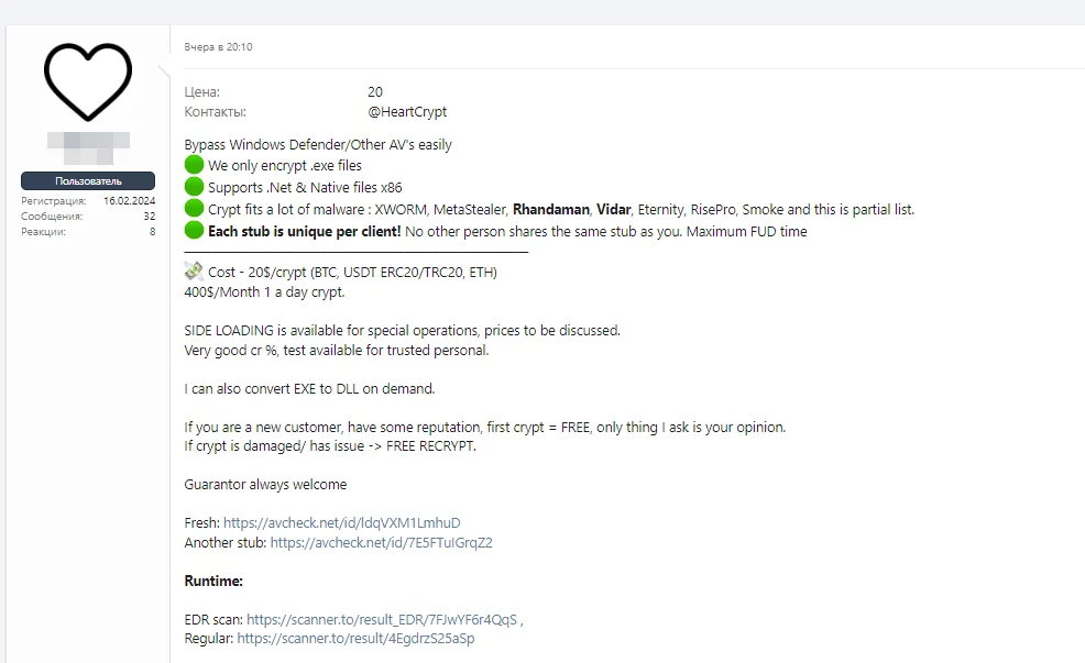 Nascondersi nell’ombra del cyberspazio, un venditore clandestino con lo pseudonimo di @HeartCrypt ha fatto la sua mossa nella giornata di oggi, offrendo una soluzione intrigante per sfuggire agli occhi vigili degli antivirus. Sul forum underground di XSS, l’annuncio è chiaro e conciso: bypassare facilmente Windows Defender e altri AV a un prezzo accessibile.
