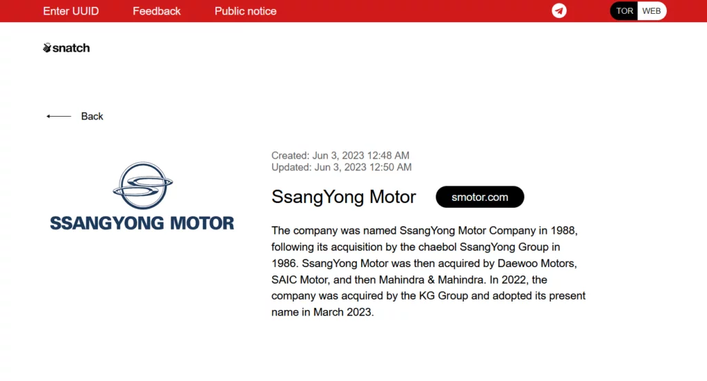 La banda di criminali informatici di Snatch, oggi revendica all’interno del proprio Data Leak Site (DLS) un attacco informatico all’azienda coreana che produce automobili SsangYong Motor Company.