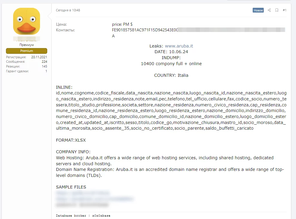 Un attore malevolo ha recentemente annunciato su un noto forum underground la messa in vendita di un database presumibilmente sottratto all’azienda italiana Aruba S.p.A. Si tratta di una delle principali aziende italiane di web hosting e registrazione domini.