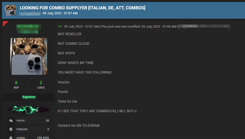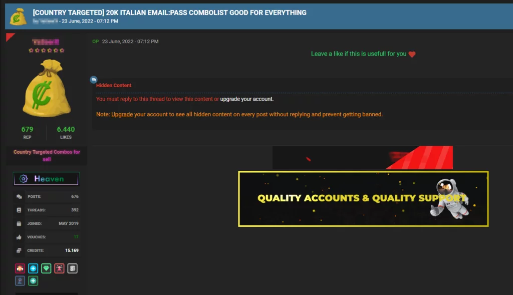 Si tratta molto spesso di vendite in modalità “combolist” (modalità combinata), dove ad esempio possono essere presenti degli accessi agli account e quindi la coppia email + password, oppure documenti di identità in forma combinata, come ad esempio selfie con documento + documento di identità fronte retro.