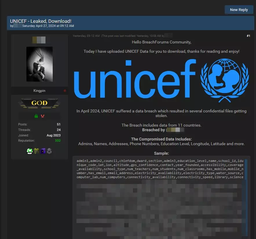 Dalle nostre attività di monitoraggio che svolgiamo costantemente nelle underground, è emerso che il 27 aprile un messaggio misterioso è comparso su Breach Forums, un noto rifugio per traffici illegali di dati. L’utente, con una buona reputazione nel sottobosco criminale, ha pubblicato informazioni riguardanti una violazione dei dati dell’UNICEF, l’organizzazione internazionale dedicata alla protezione dei diritti dei bambini.