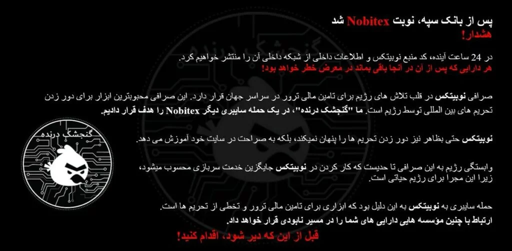Dopo Bank Sepah, è stato il turno di Nobitex. Avvertimento! Nelle prossime 24 ore pubblicheremo il codice sorgente di Nobitex e le informazioni interne dalla sua rete interna. Tutti i beni lasciati lì dopo saranno a rischio! Lo scambio Nobitex è al centro degli sforzi del regime per finanziare il terrore in tutto il mondo. Questo scambio è lo strumento più diffuso utilizzato dal regime per eludere le sanzioni internazionali. Noi, i Predatory Sparrow, abbiamo preso di mira Nobitex con un altro attacco informatico. Nobitex non nasconde nemmeno il fatto di aggirare le sanzioni, ma lo dichiara esplicitamente sul suo sito web. La dipendenza del regime da questo scambio è tale che lavorare alla Nobitex è considerato un’alternativa al servizio militare, poiché questo canale è di vitale importanza per il regime. L’attacco informatico a Nobitex è avvenuto perché è uno strumento per finanziare il terrorismo e violare le sanzioni. L’associazione con tali istituzioni porterà i tuoi beni alla distruzione.