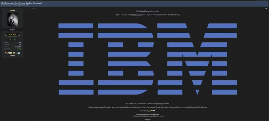 Recentemente, il noto Threat Actor, identificato con il nickname 888, ha affermato di aver violato i sistemi di IBM e di aver sottratto dati personali appartenenti ai dipendenti dell’azienda. La fuga di notizie, datata ottobre 2024, avrebbe portato alla compromissione di circa 17.500 righe di dati.