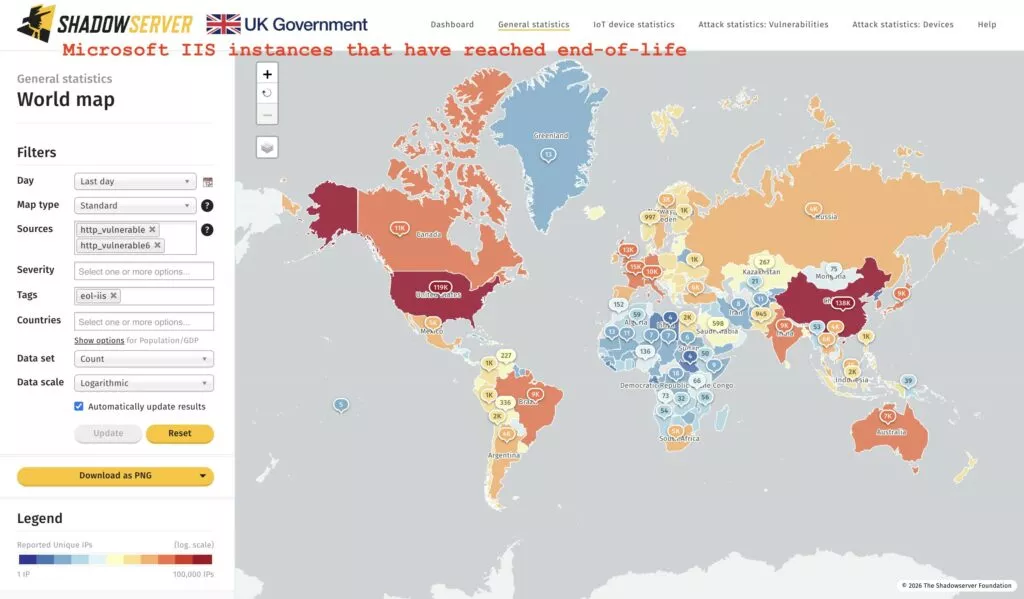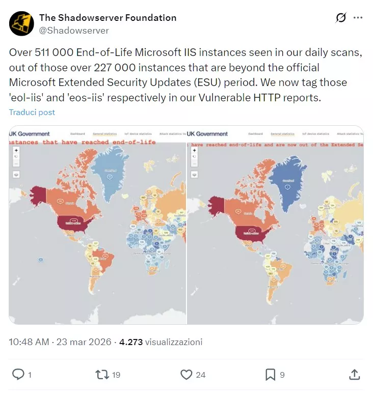 Un recente tweet ha riportato alla luce un problema tanto vecchio quanto preoccupante: oltre 511 mila istanze di Microsoft IIS risultano oggi fuori dal ciclo di vita ufficiale, e più di 227 mila di queste hanno superato persino il periodo di Extended Security Updates.