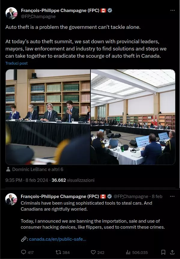 Il tweet dell’8 febbraio 2024 dall’account del Ministro dell’Innovazione, Scienza e Industria canadese, François-Philippe Champagne, lascia pochi dubbi in proposito: a causa dell’aumento del furto di auto, in Canada sarà vietata l’importazione, l’uso e la detenzione degli strumenti di hacking, come il FlipperZero.