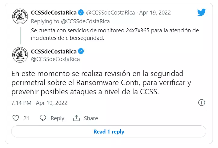 Domenica 8 maggio, il neoeletto presidente costaricano Chaves ha dichiarato un’emergenza nazionale adducendo come motivo gli attacchi ransomware Conti in corso. Conti ransomware aveva originariamente rivendicato un attacco ransomware contro enti governativi costaricani il mese scorso.