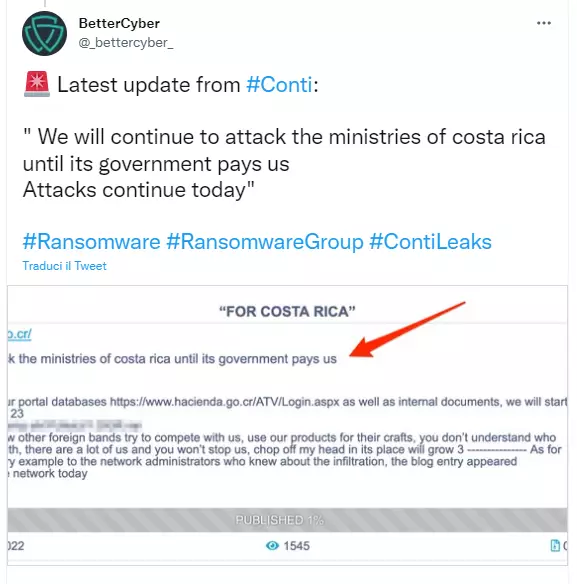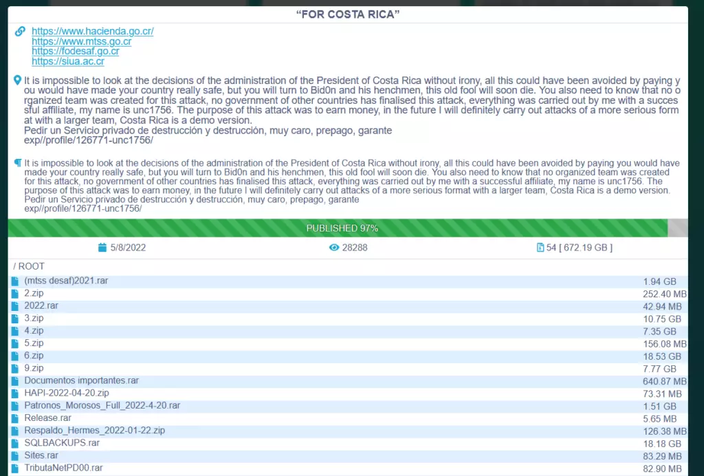 La famigerata cybergang Conti ransomware ha pubblicato la maggior parte del dump, relativo a 672 GB che sembrano contenere dati appartenenti alle agenzie governative costaricane.