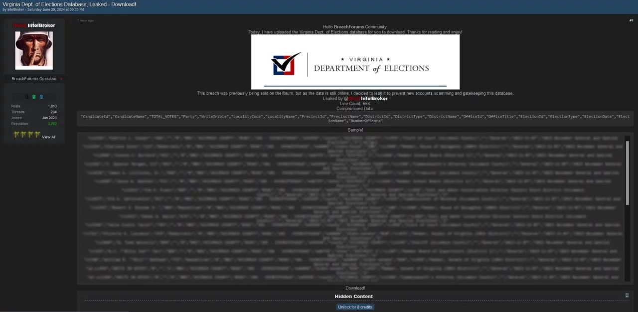 Un incidente di sicurezza ha colpito il Dipartimento delle Elezioni della Virginia, con la diffusione non autorizzata di un vasto database elettorale. L’attacco, rivendicato da un utente noto come IntelBroker, è stato reso pubblico attraverso un forum online dedicato alle violazioni di dati.
