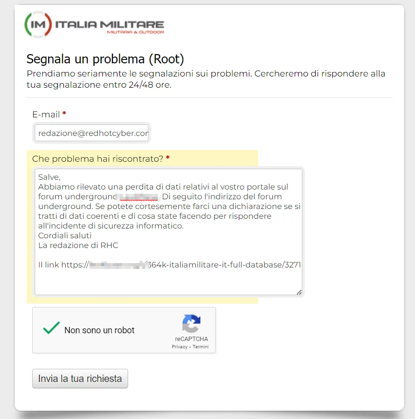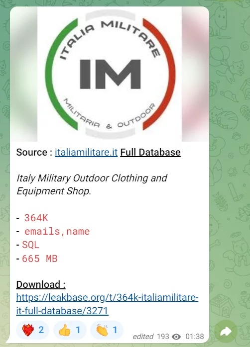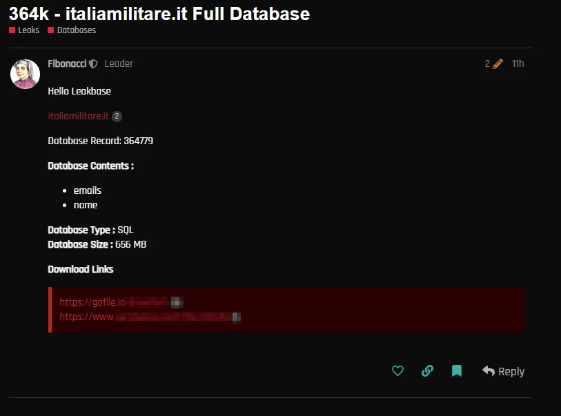 Sul forum underground pubblicato dal post Telegram, l’utente “fibonacci”, mette a disposizione un database di 655MB (in formato .sql), nel quale sono presenti 364.000 record di utenti del portale italiano italiamilitare.it.