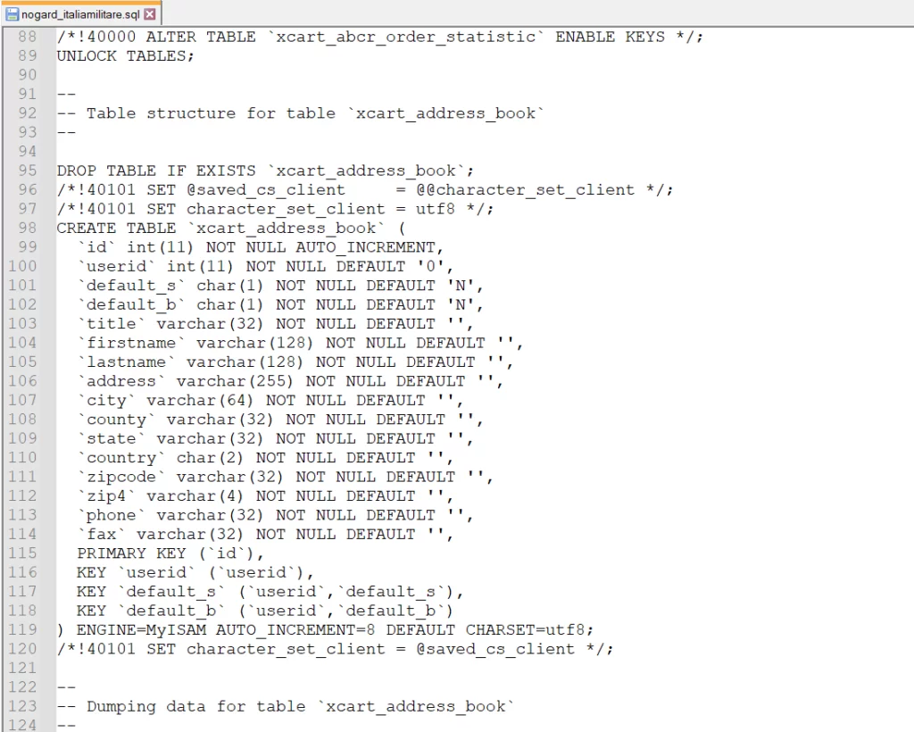 Nei samples messi a disposizione dal criminale informatico, viene riportata un file in Data Definition Lenguage (DDL) che contiene lo schema del database e una serie di occorrenze per ogni tabella. il file contiene circa 41MB di informazioni.