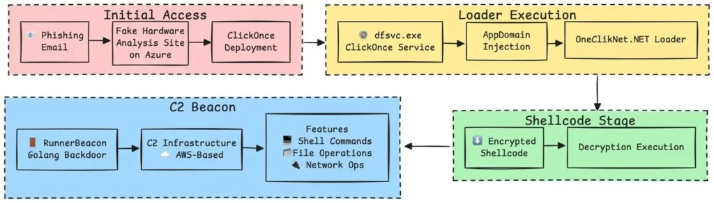 In poche parole, gli attacchi di phishing sfruttano un loader basato su .NET denominato OneClikNet per distribuire una sofisticata backdoor basata su Go, nome in codice RunnerBeacon, progettata per comunicare con un’infrastruttura controllata dall’aggressore e oscurata tramite i servizi cloud di Amazon Web Services (AWS).