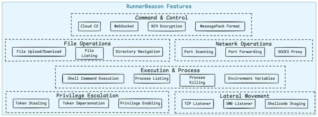 Inoltre, la backdoor incorpora funzionalità anti-analisi per eludere il rilevamento e supporta operazioni di rete come la scansione delle porte, l’inoltro delle porte e il protocollo SOCKS5 per facilitare le funzionalità di proxy e routing. “Il design di RunnerBeacon è molto simile ai beacon Cobalt Strike basati su Go (ad esempio la famiglia Geacon/Geacon plus/Geacon Pro)”, hanno affermato i ricercatori.