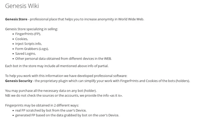 Genesis ha venduto credenziali rubate, cookie ed identità virtuali nel corso di diversi anni di attività. Il sito è stato collegato a una serie di attacchi motivati finanziariamente in tutto il mondo, che vanno da semplici truffe ad attacchi ransomware.