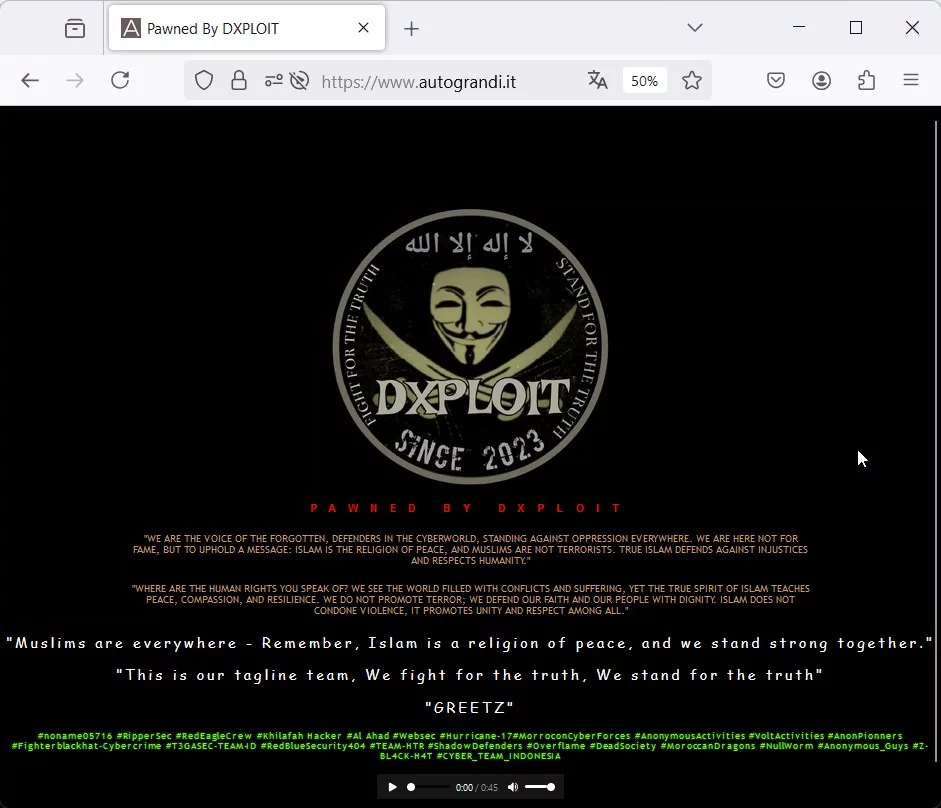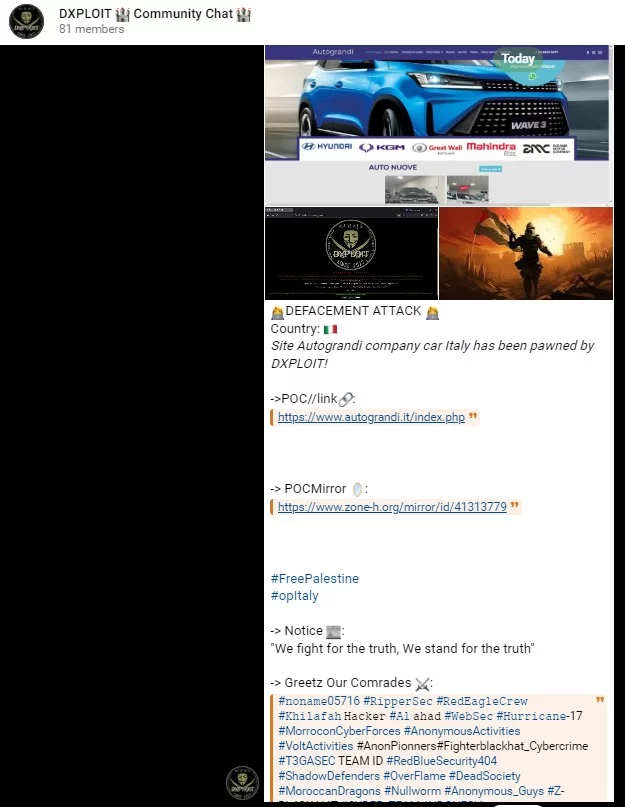 Recentemente, il sito web Autograndi.it è stato violato e la pagina di defacement ha portato un messaggio da parte degli hacktivisti cibernetici che si identificano come parte del collettivo DXPLOIT. Il titolo della pagina violata, “PAWNED BY DXPLOIT”, è stato accompagnato da un messaggio che rivendica una causa ideologica.
