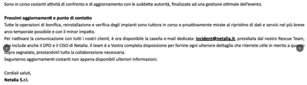 Essendo Netalia fornitore di servizi cloud per numerose grandi aziende e pubbliche amministrazioni, la violazione subita potrebbe avere effetti a catena sui tanti clienti finali. Un’interruzione prolungata dei sistemi o un’eventuale compromissione dei dati rischia di riflettersi direttamente su altre aziende che dipendono dai servizi del provider, amplificando l’impatto dell’attacco.