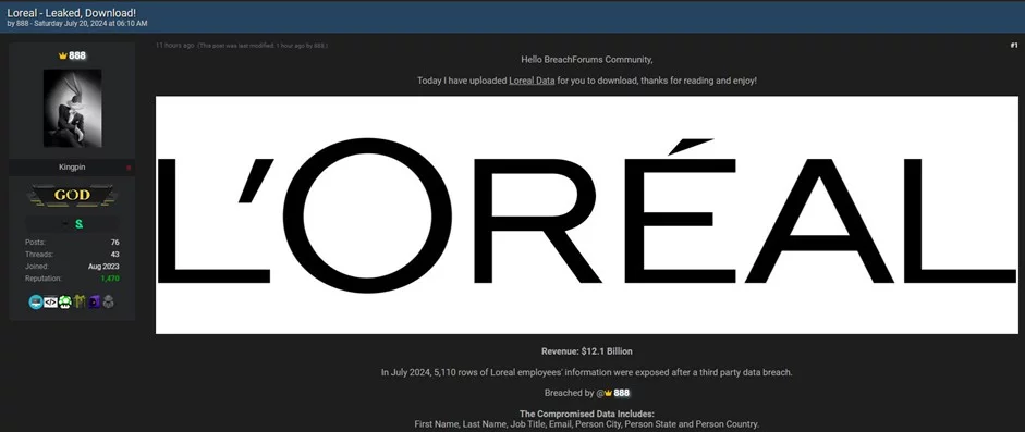 Recentemente, un noto attore di minacce, identificato come 888, ha reso pubblica una presunta violazione dei dati ai danni di L’Oréal, famosa azienda operante nel settore bellezza e cosmetici.