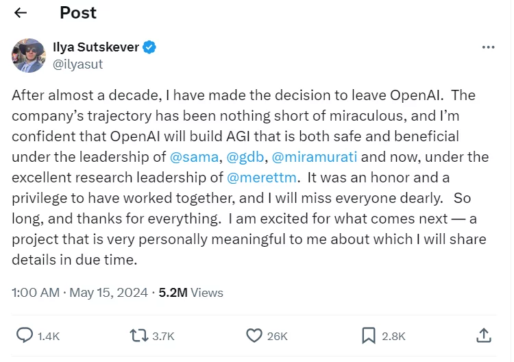 “Dopo quasi un decennio, ho preso la decisione di lasciare OpenAI”, ha detto Sutskever in un post su X. Sutskever ha pubblicato che sta lavorando a un nuovo progetto “che è molto significativo per me a livello personale e di cui condividerò i dettagli a tempo debito”.