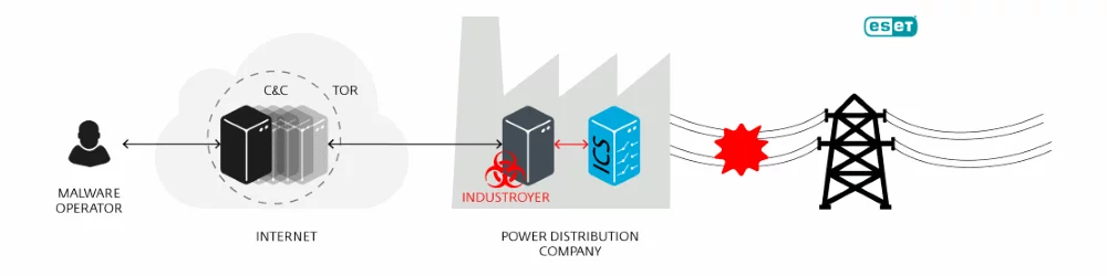 Il malware Industroyer è stato utilizzato in un massiccio attacco informatico in Ucraina il 17 dicembre 2016; l’attacco a tempo ha preso di mira le sottostazioni di distribuzione dell’elettricità a Kiev e ha assunto il controllo degli interruttori di circuito negli ICS per tagliare l’elettricità, portando a sostanziali blackout che sono durati molte ore. “Con ciò, si è unito a un club d’élite di sole tre famiglie di malware note per essere utilizzate negli attacchi contro ICS”, quali BlackEnergy, Stuxnet e Havex.