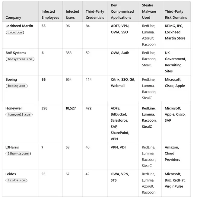 Lo Studio Hudson Rock mostra che decine di dipendenti di importanti appaltatori della difesa, tra cui Lockheed Martin e Boeing così come il personale dell’esercito e della marina degli Stati Uniti, sono stati infettati dagli infostealer. Credenziali, sessioni VPN, e-mail e persino l’accesso a sistemi di approvvigionamento chiusi sono ora nelle mani dei criminali informatici.