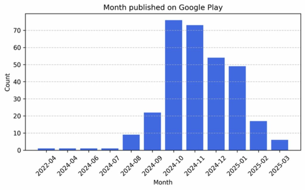 La maggior parte delle applicazioni analizzate è stata pubblicata o aggiornata tra la fine del 2023 e l’inizio del 2024. Gli aggiornamenti distribuiti in questo periodo hanno introdotto componenti e comportamenti malevoli che non erano presenti nelle versioni precedenti.