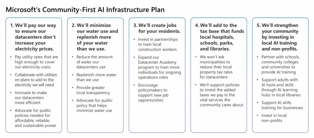 Microsoft è stata la prima grande azienda tecnologica a rispondere ufficialmente a questo indirizzo politico. Il gruppo ha comunicato l’intenzione di sostenere integralmente i costi infrastrutturali legati al proprio fabbisogno energetico, impegnandosi a non trasferire alcun onere sulle comunità locali. Poco dopo le dichiarazioni del presidente, il vicepresidente e presidente di Microsoft, Brad Smith, ha pubblicato un documento programmatico intitolato “Building Community-First AI Infrastructure“.