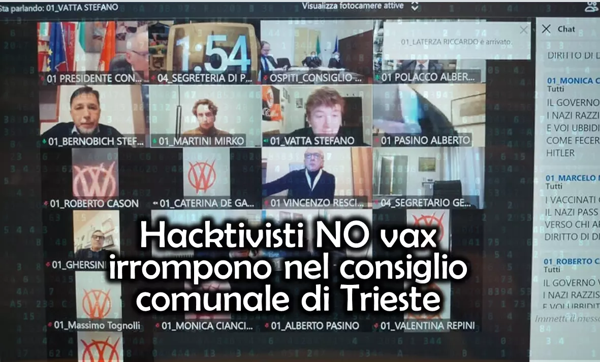 Notizia più recente è che durante una abituale video conferenza al Consiglio Comunale di Trieste, degli hacktivisti NO Vax (nello specifico il gruppo V_V), hanno fatto irruzione nella piattaforma informatica nella giornata di ieri pomeriggio.