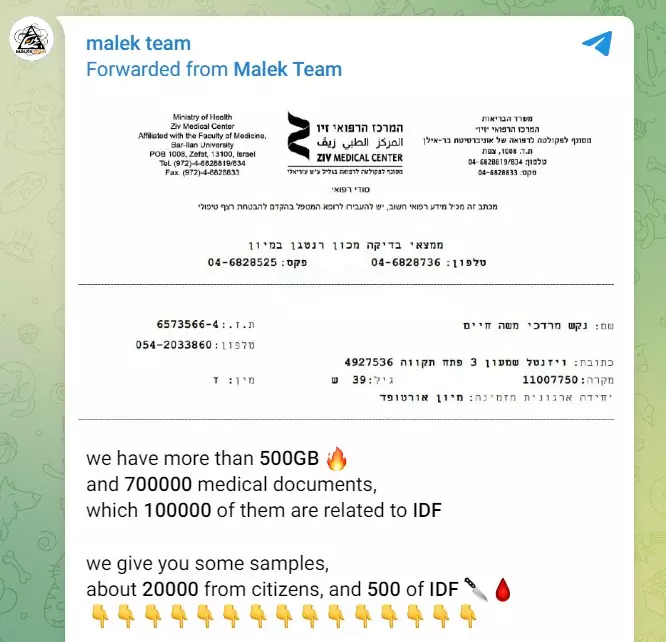 Un gruppo di hacker ritenuti collegati all’Iran ha affermato di aver rubato migliaia di cartelle cliniche dall’ospedale Ziv Medical Center in Israele. Secondo loro, tra i dati rubati ci sono i registri del personale militare israeliano.