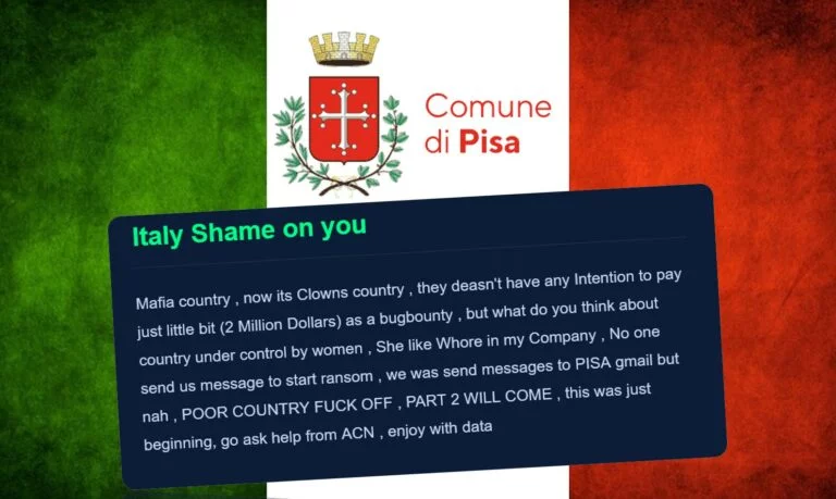I black hacker di NOVA tornano a colpire, e questa volta con insulti all’Italia dopo la pubblicazione dei dati del presunto attacco informatico al Comune di Pisa. Dopo aver rivendicato l’attacco il 10 maggio 2025, il gruppo criminale ha pubblicato i primi dati rubati, esattamente 11 giorni dopo l’annuncio sul loro forum underground.