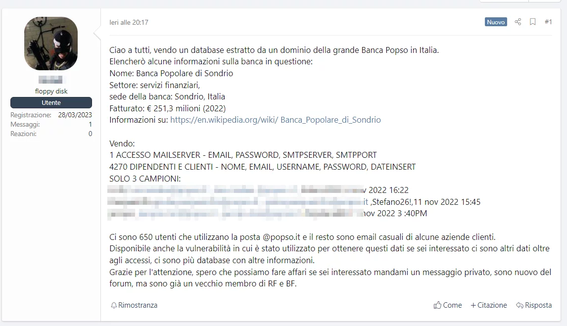 Nel post veniva riportato che il Threat Actors aveva a disposizione una serie di informazioni della Banca Popolare di Sondrio, come ad esempio l’accesso al server di posta elettronica ed una serie di account mail e relative password.