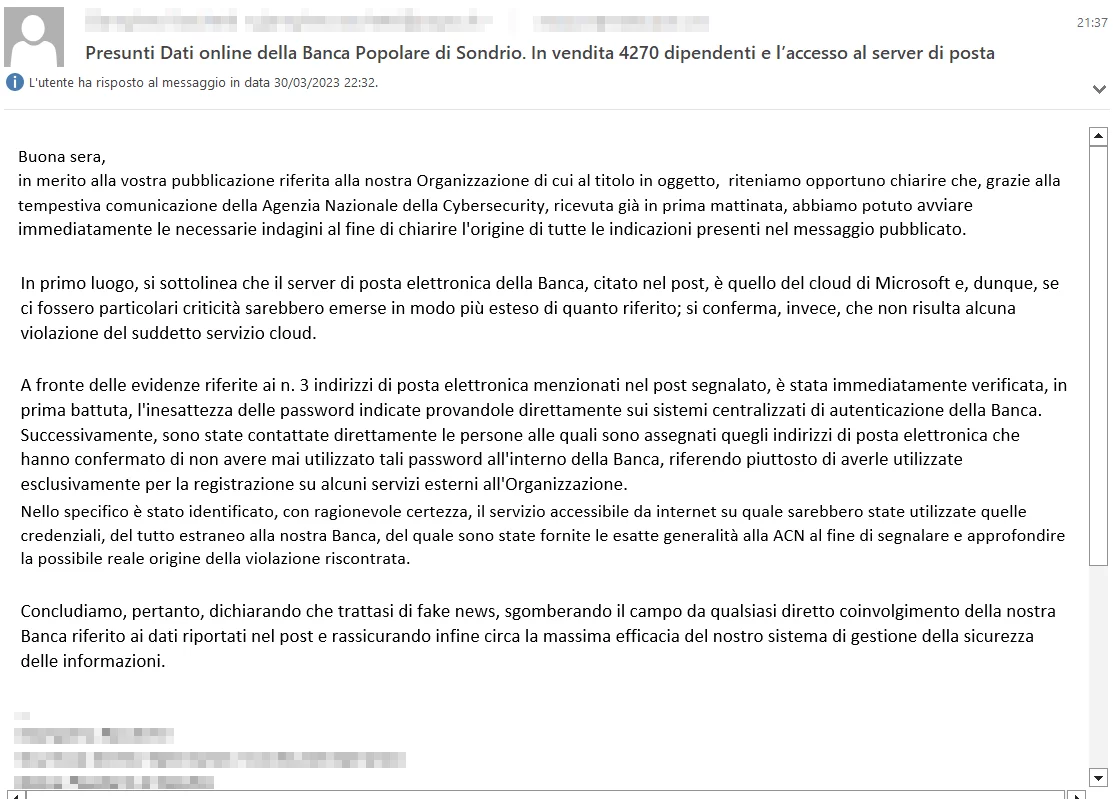 Nella mail arrivata in redazione, la Banca Popolare ha riportato che “grazie alla tempestiva comunicazione della Agenzia Nazionale della Cybersecurity” sono state effettuate delle analisi e verificato che l’informazione pubblicata dal Threat Actors era una fake news.