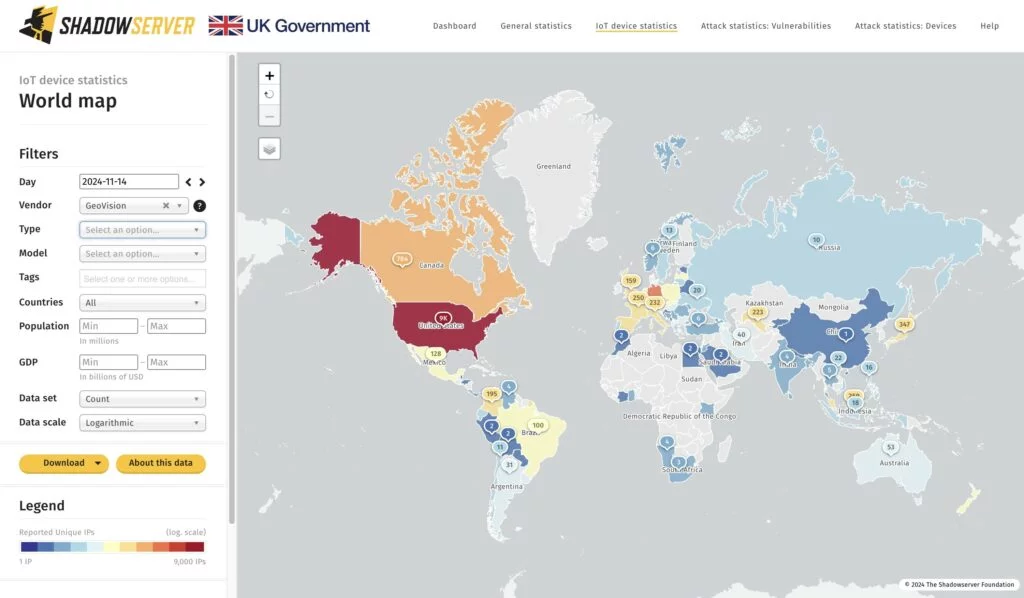 Secondo la Shadowserver Foundation, attualmente sulla rete sono presenti circa 17.000 dispositivi GeoVision vulnerabili a CVE-2024-11120.