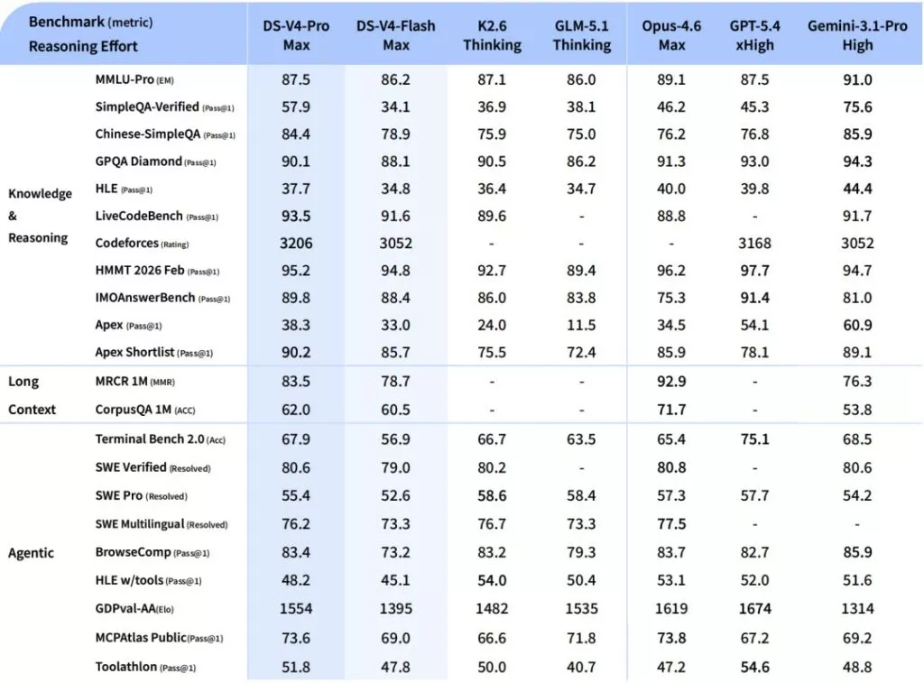 DeepSeek afferma che V4-Pro è stato addestrato su 33 trilioni di token e che, nella sua suite di benchmark, il modello supera tutti i sistemi open-weight e si avvicina alle migliori soluzioni occidentali a ciclo chiuso.
