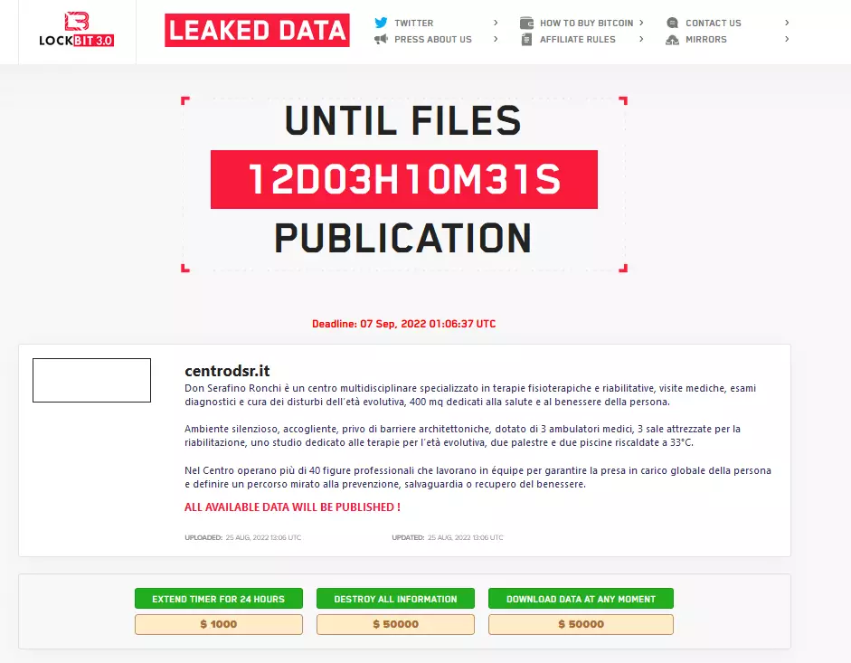 LockBit 3.0 avvia il consueto “countdown” fissato a 12gg, data della pubblicazione dei dati esfiltrati nelle underground, ovvero il 7 Settembre alle 01:06 orario UTC.