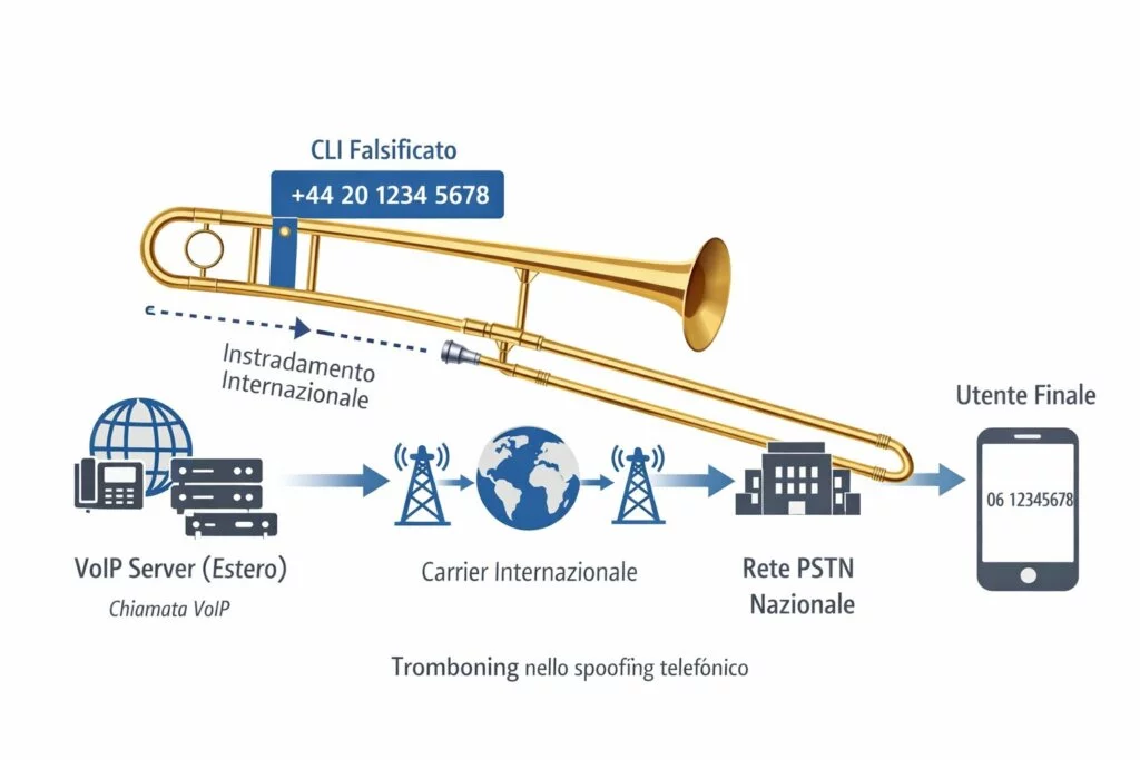 Il tromboning sfrutta esattamente questo punto cieco: la chiamata viene manipolata fuori giurisdizione e rientra nella rete italiana come traffico apparentemente nazionale, sottraendosi ai filtri pensati per il traffico internazionale.