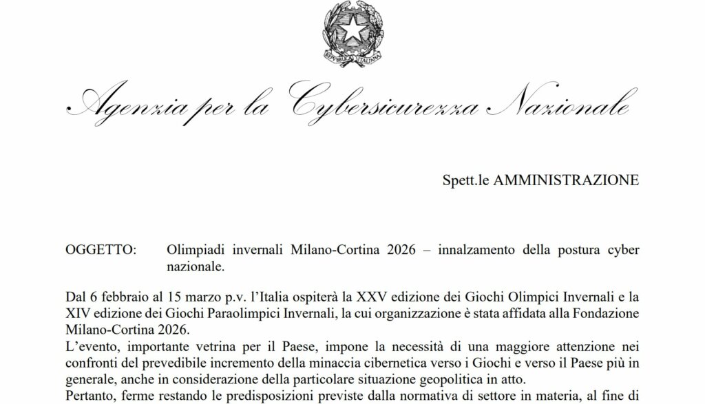 La PEC inviata da Agenzia per la Cybersicurezza Nazionale a tutti i soggetti NIS2, con il richiamo all’aumento della minaccia in vista di Milano–Cortina 2026, è formalmente corretta, tecnicamente condivisibile e concettualmente inattaccabile.