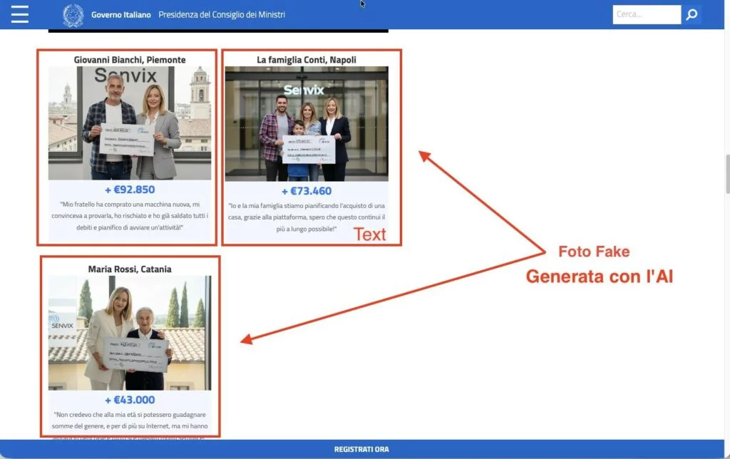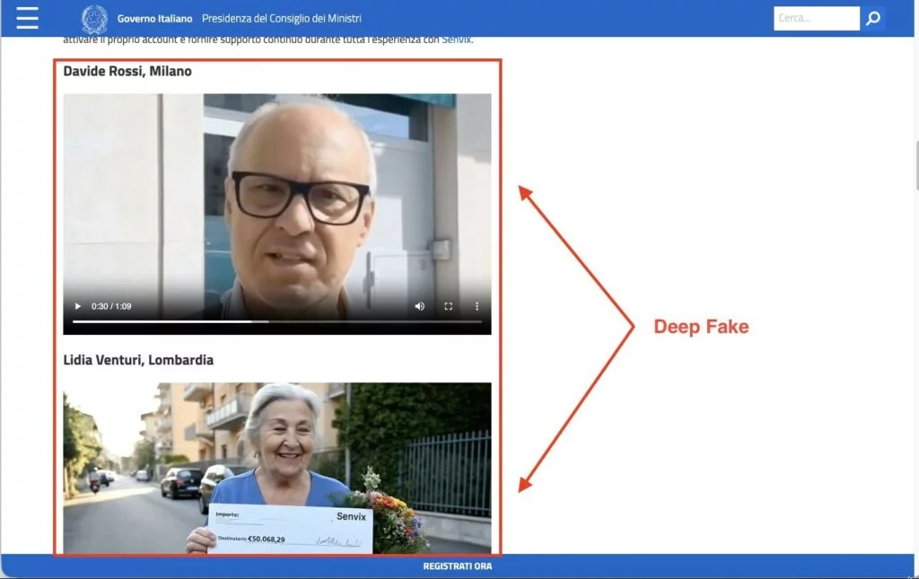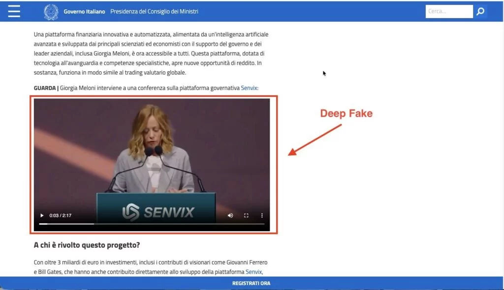 Inoltre all’interno del sito presidenzagoverno[.]com sono presenti diversi video deepfake, come ad esempio quello della presidente del consiglio dei ministri Giorgia Meloni, che riporta la qualità della piattaforma Senvix.