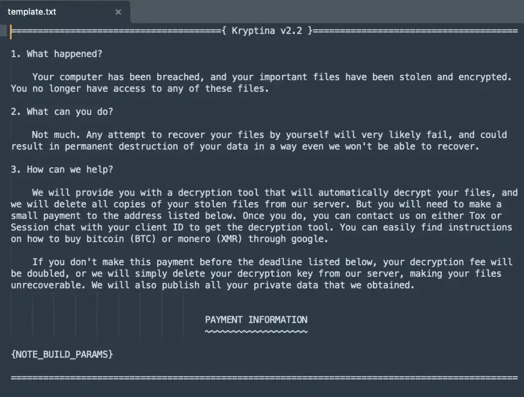 Una delle caratteristiche chiave che ha contribuito alla rinascita di Kryptina è la sua capacità di adattarsi alle esigenze degli attaccanti. L’integrazione di tecnologie più recenti e la facilità di personalizzazione hanno aumentato il suo appeal. I criminali informatici possono configurare il ransomware per mirare a specifici settori o aziende, aumentando le possibilità di successo dell’attacco.