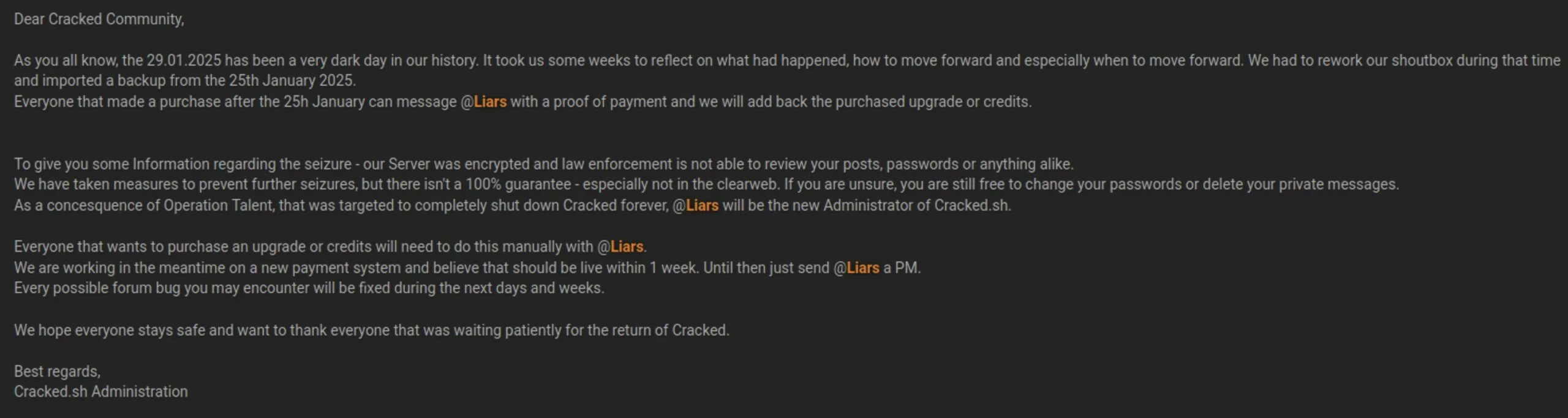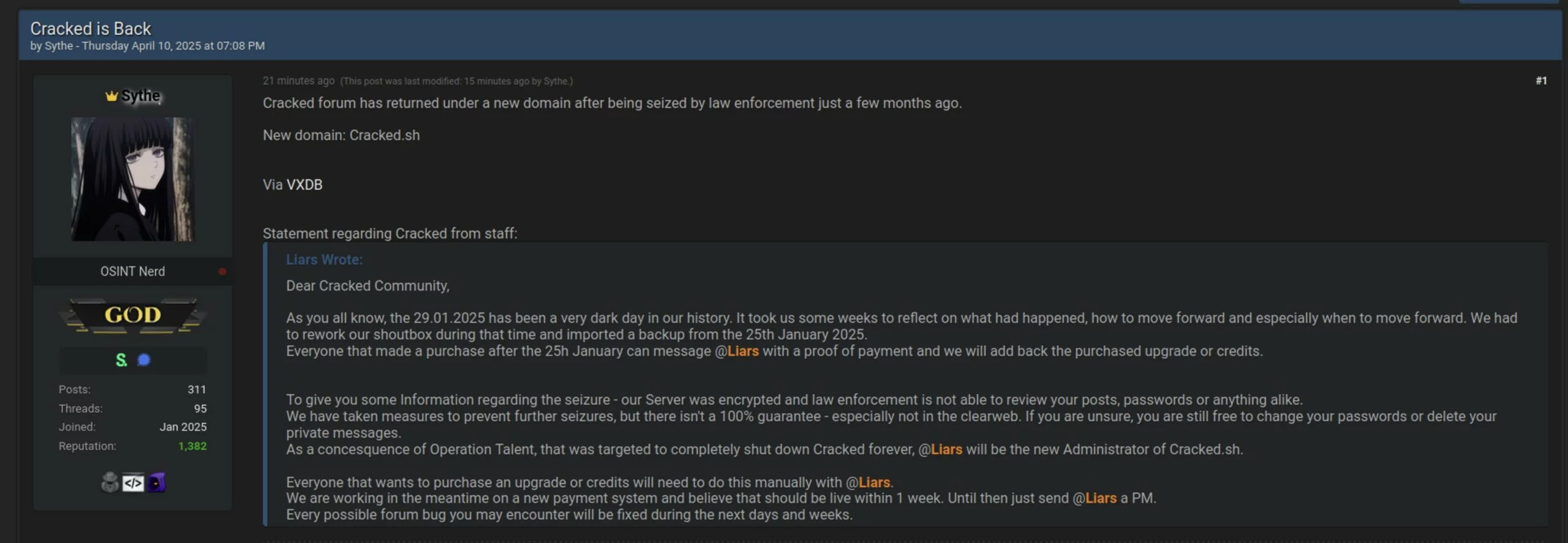 L’amministratore ha ora un nuovo “volto”: @Liars, che ha preso le redini della piattaforma. Sarà lui il punto di riferimento per chiunque voglia ripristinare gli upgrade o i crediti acquistati dopo il 25 gennaio (data dell’ultimo backup recuperabile), oppure effettuare nuovi acquisti – per ora, solo via messaggio privato.