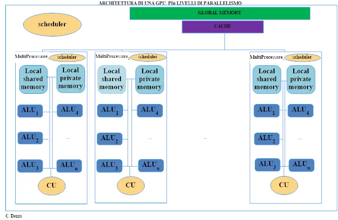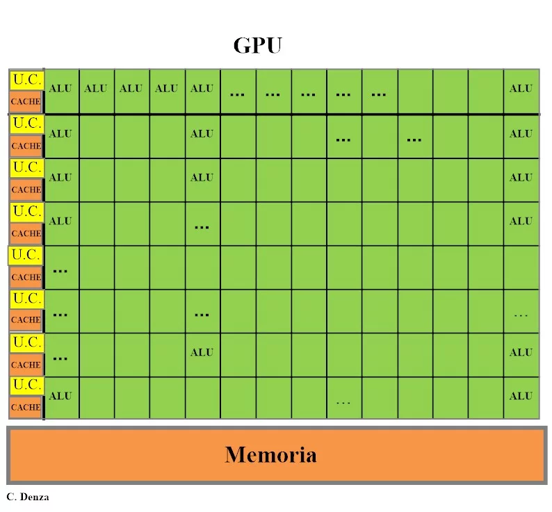 Le GPU CUDA sono organizzate in array di Streaming Multiprocessors (SM), unità operative che integrano CUDA Core, una memoria condivisa veloce e uno scheduler per gestire e distribuire i task. Questi SM permettono di ottenere elevate prestazioni nel calcolo parallelo, grazie anche a una memoria globale ad alta velocità (GDDR) con ampia banda passante.