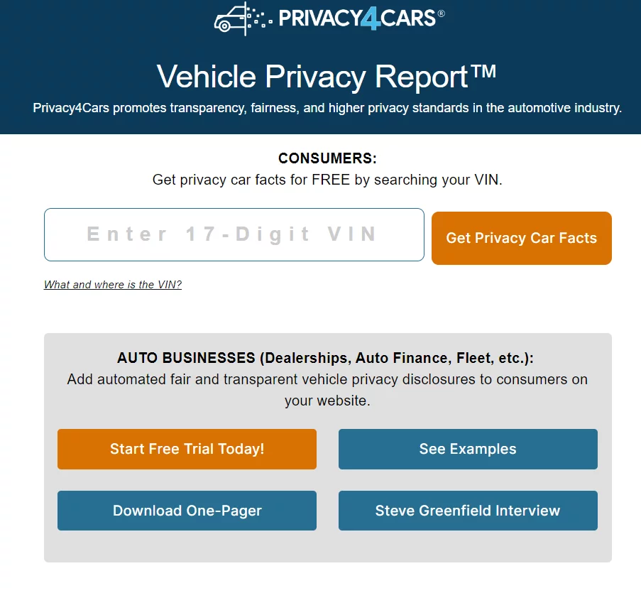 Privacy4Cars ha rilasciato un nuovo strumento chiamato “Rapporto sulla privacy del veicolo” che mostra quali informazioni possono essere raccolte su un particolare veicolo. Inserendo il VIN del veicolo, l’utente può vedere ciò che le case automobilistiche potrebbero sapere. Si stima che le automobili possano produrre 25 GB di dati all’ora.