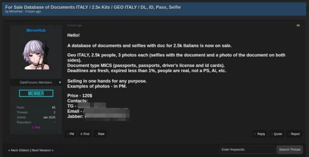 Un thread su un forum underground, mostra un post di un criminale informatico che mette in vendita di un database contenente documenti e selfie di cittadini italiani. L’autore, identificato come MirrorHub, sta proponendo una "collection" di circa 2.5K record con immagini e documenti a un prezzo estremamente basso. Sono presenti passaporti, carte d’identità e patenti di italiani, con dichiarazioni sulla freschezza dei dati.