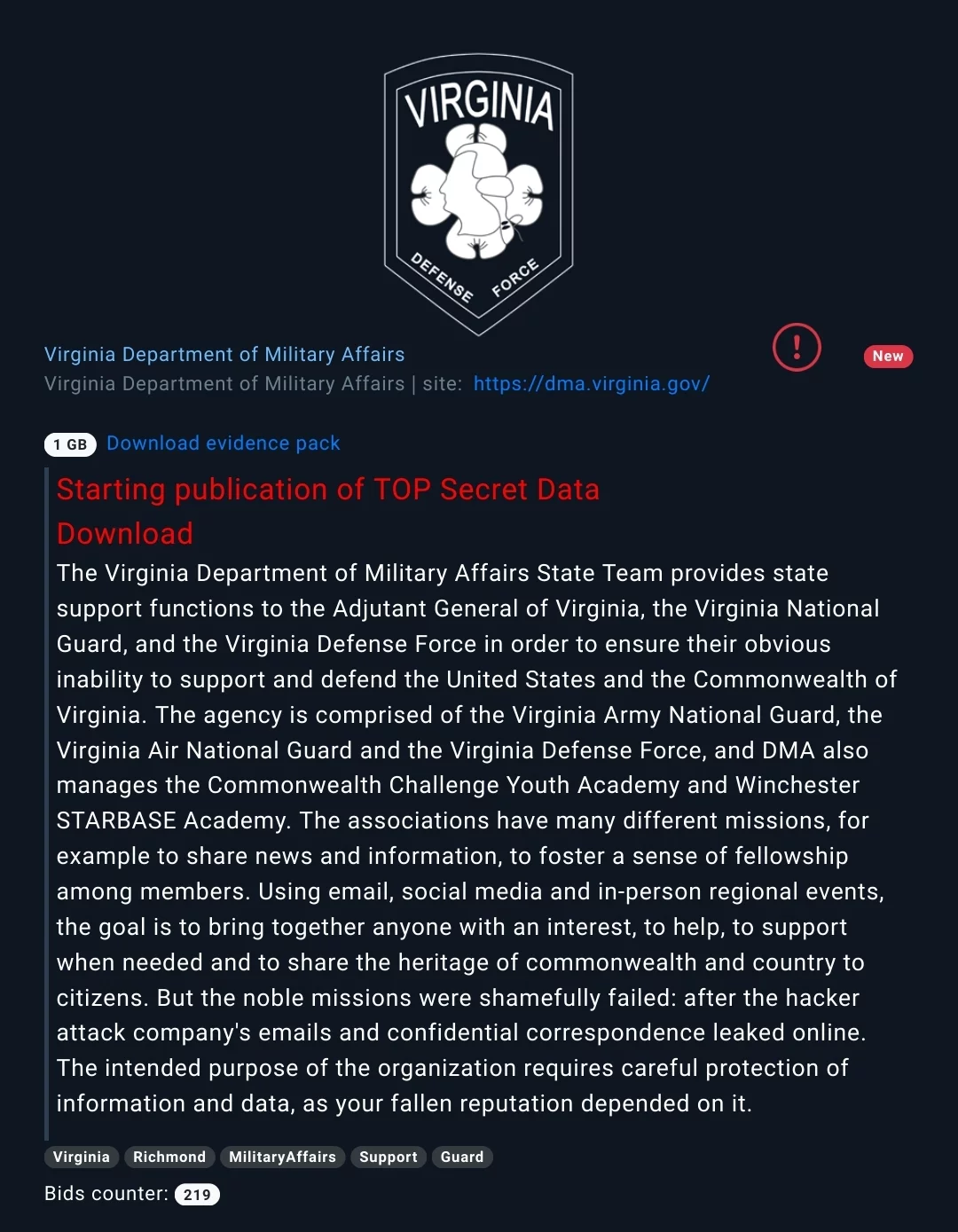 La Virginia Defense Force è stata vittima di un attacco ransomware fa parte di Marketo Ransomware Group, una cyber gang che ha pubblicato circa 1 gb di informazioni riservate e top-secret.