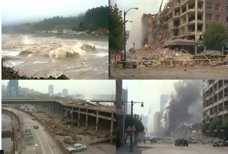 Ha anche elencato i luoghi in cui si è verificato il disastro. Un’immagine mostra presumibilmente il centro di Seattle crollato, mentre un’altra mostra i soccorritori che estraggono i sopravvissuti dalle macerie a Vancouver.